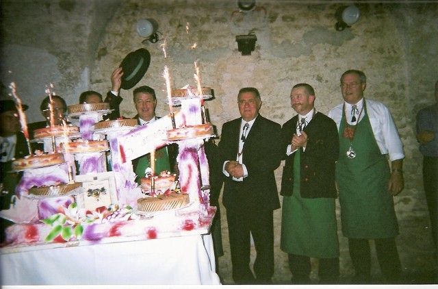 Cette grande Cérémonie entraîna tous les convives vers un repas dansant somptueux préparé par "les Etapes Gourmandes en Beaujolais" , largement arrosé des meilleurs crus de ce même Beaujolais et animé par les "MARDY'S"dans l'immense cave du cuvage et se termina tard bien après le gateau